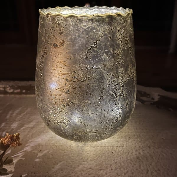 A stunning glass votive holder with a weathered antique gold look! These votive holders are a versatile addition to your decorative displays that will look great wherever you place them!