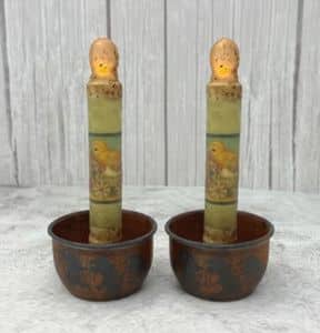 Joyful Easter timer taper has a grungy, burnt ivory wax coating. The center portion of the taper is embedded with the image of two baby chicks and a wagon with the phrase, “A Joyful Easter”. It has a built-in timer function that keeps the candle lit for 6 hours, then off for 18 hours.
