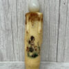 Joyful Easter timer taper has a grungy, burnt ivory wax coating. The center portion of the taper is embedded with the image of two baby chicks and a wagon with the phrase, “A Joyful Easter”. It has a built-in timer function that keeps the candle lit for 6 hours, then off for 18 hours.