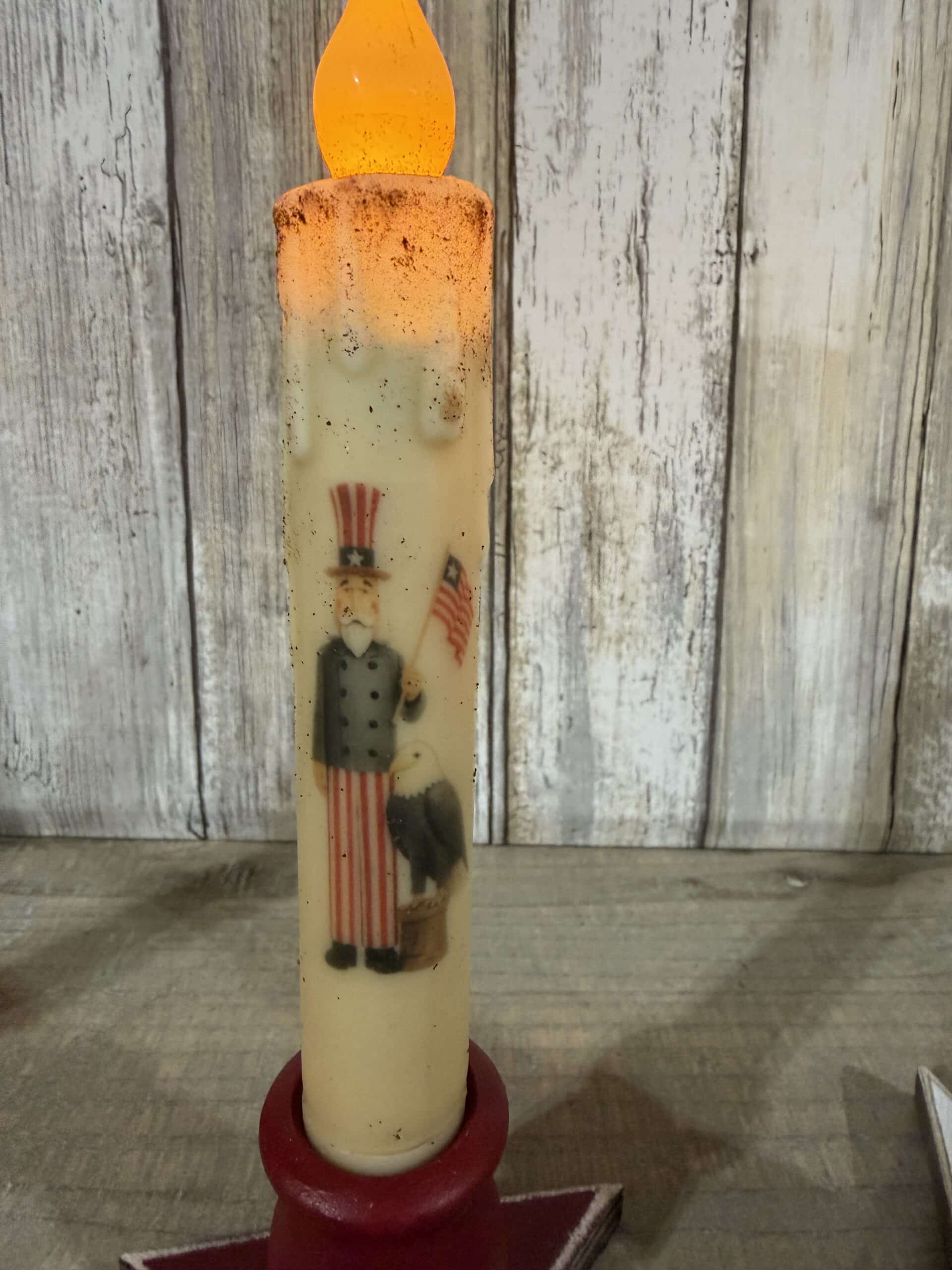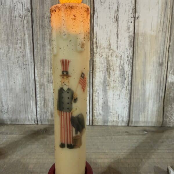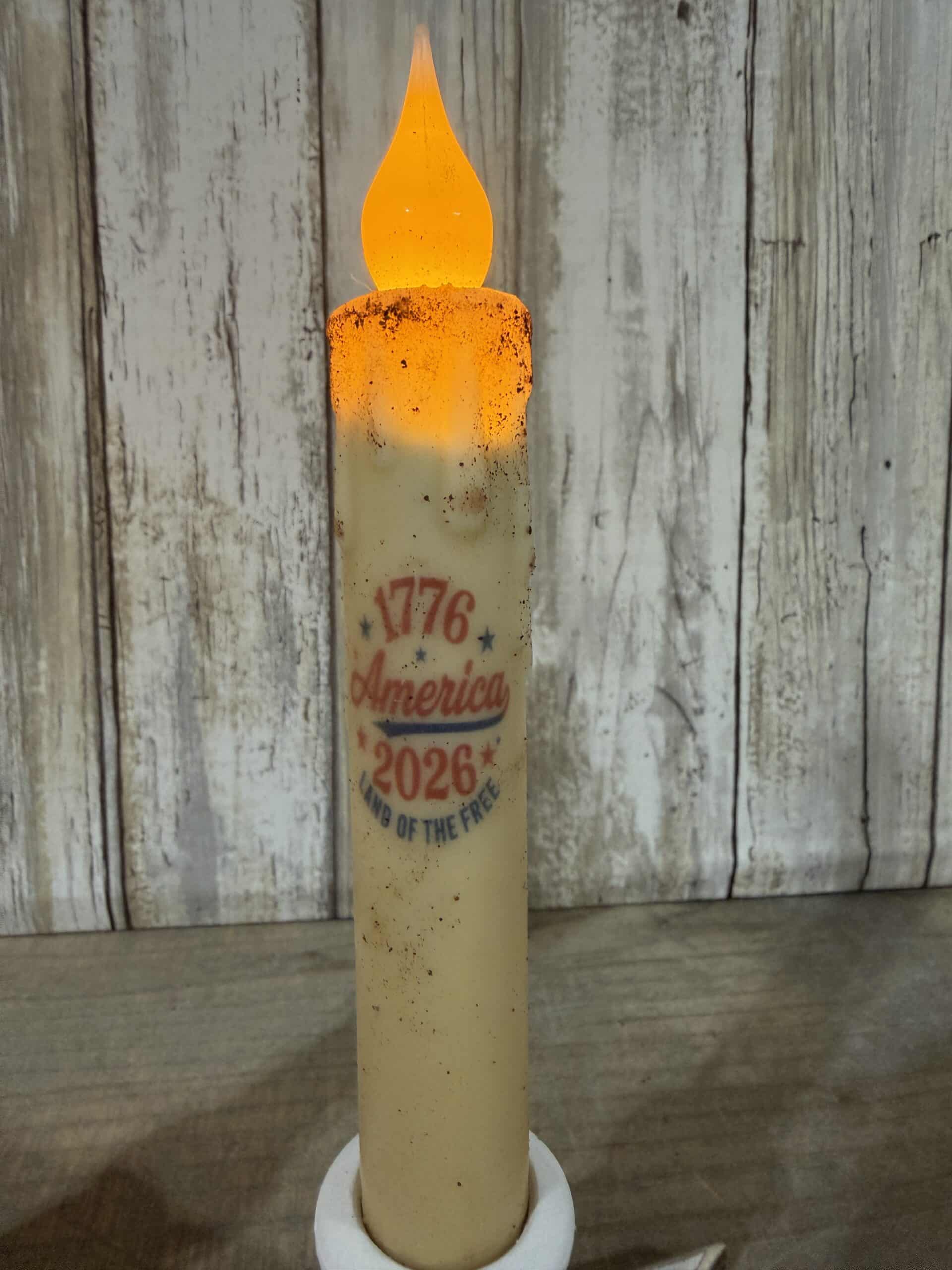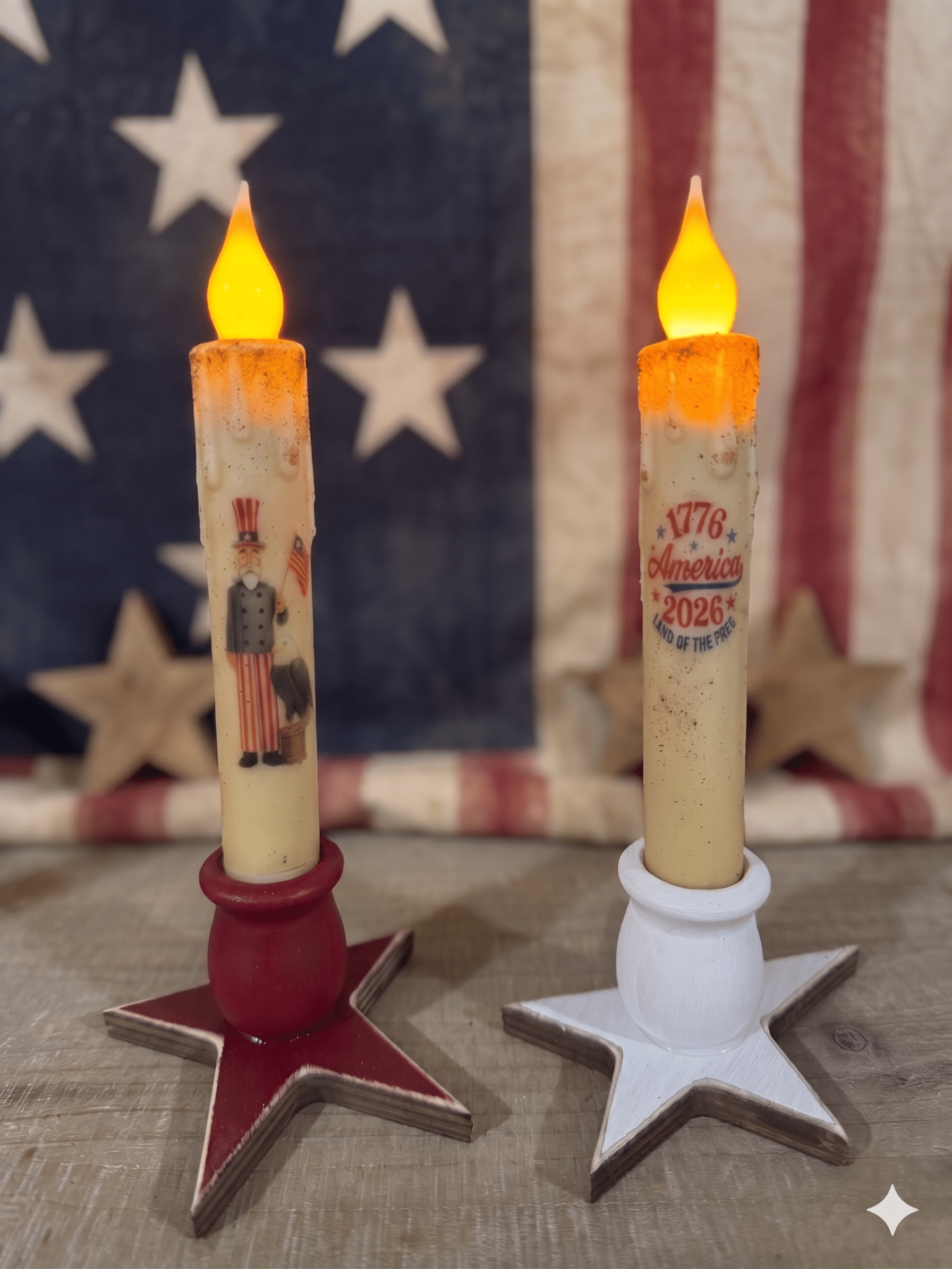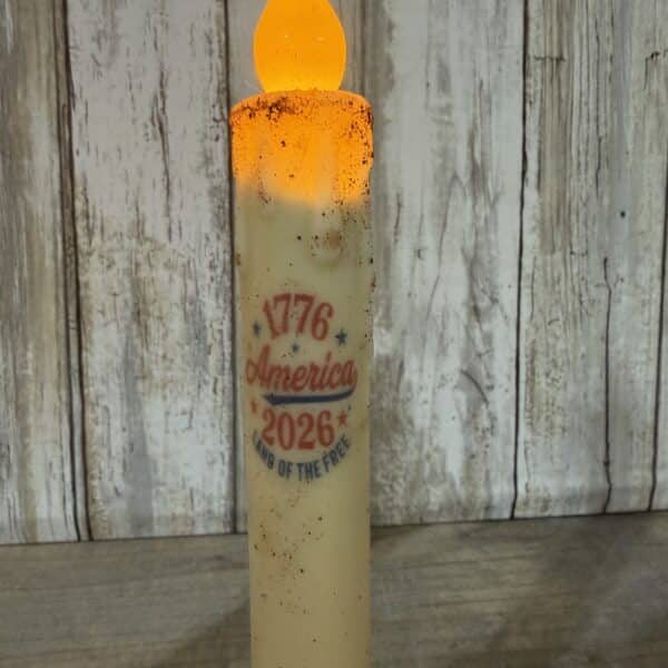 Illuminate your home with a glow of timeless patriotism. This set of two 7″ LED Americana Taper Candles brings a warm, vintage charm to your Independence Day celebrations or year-round farmhouse decor. Each candle features a hand-distressed, “grungy” wax finish that perfectly mimics the look of a traditional primitive candle without the worry of an open flame.