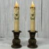 Timer is on 6 hours and off for 18 hours. Led candle bulb is also dipped in wax. Taper measures 7” long and is about ¾” in diameter and the base is tapered to fit any standard taper holder.
