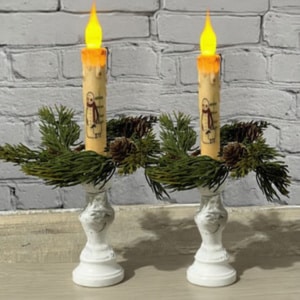 This taper is wax dipped with a snowman, tree, and lamb in the center of the taper and has a timer. The timer function will start on its own once two “AA” batteries (not included) are inserted.