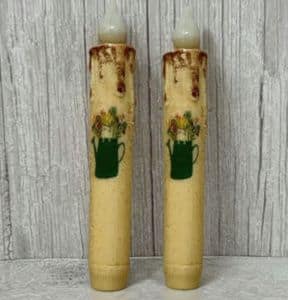 This taper is wax dipped with a watering can filled with flowers in the center of the taper and has a timer. The timer function will start on its own once two “AA” batteries (not included) are inserted.