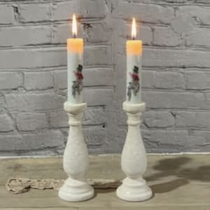 This white taper is wax dipped with an adorable snowman and litter deer in the center of the taper and has a timer. The timer function will start on it’s own once two “AA” batteries (not included) are inserted.