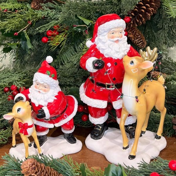 Get into the holiday spirit with this charming ceramic Looh (resin) Santa and deer figurine! This festive Santa measures 9″ H x 5″ W x 7″ D and is cozied up with an adorable deer wearing a cute red bow . Santa sports a classic red suit with white trim and black boots, adding a touch of nostalgic charm to your holiday decor. Perfect for display on a mantle, tabletop, or amidst your Christmas greenery!