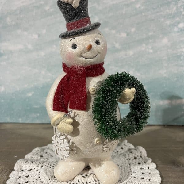- Features a snowman standing holding a miniature wreath