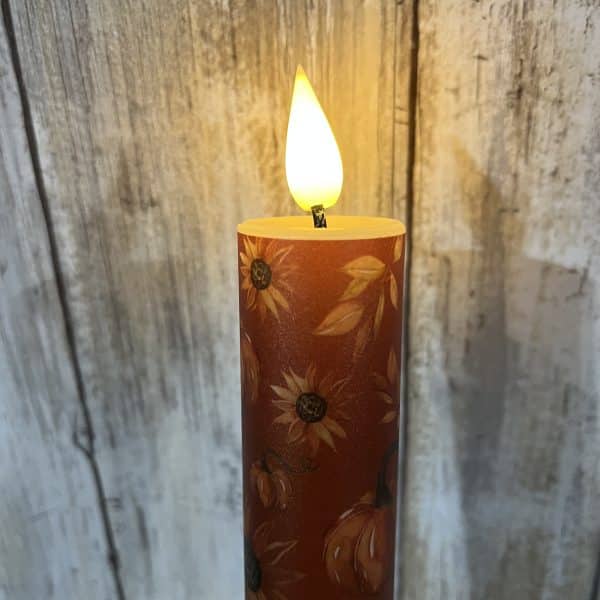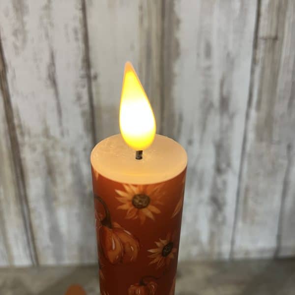 Set the scene with this set of two Shades of Autumn 3D Flame candles. Adorned with sunflowers and pumpkins, these candles emit a soft glow from a gently flickering flame creating a cozy ambiance to relax, unwind and get comfortable.
