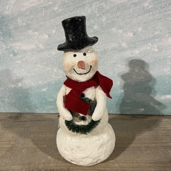 Bring the joy of the season into your home with this delightful resin snowman with pine wreath. Order now and make your winter wonderland complete!”