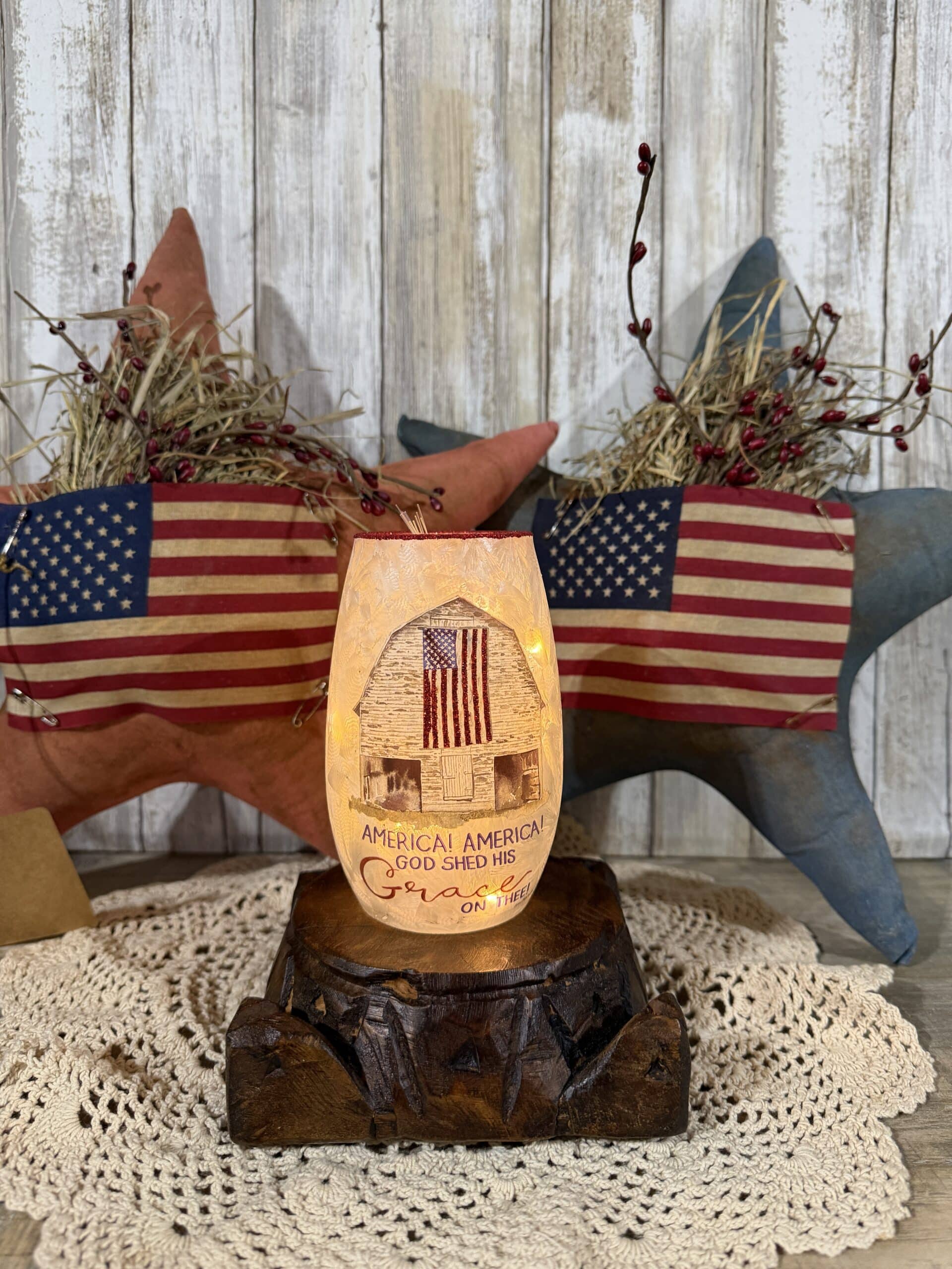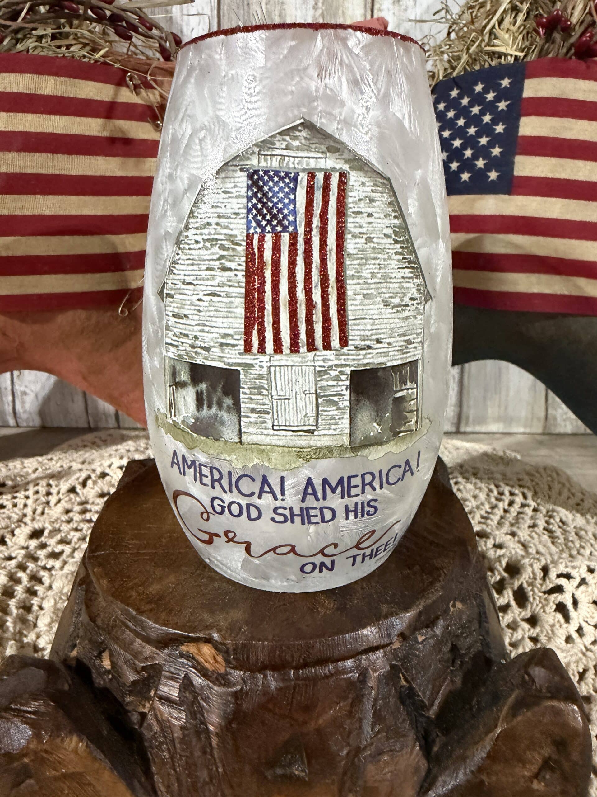 A textured glass vase glowing with fairy lights, printed with a weathered barn and a glittery flag, plus the lyric “AMERICA! AMERICA! GOD SHED HIS Grace ON THEE!” in navy and red script. The rim is edged in red glitter.