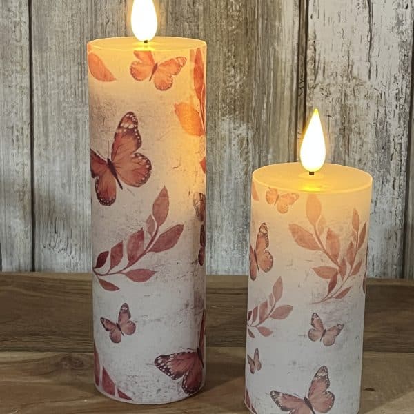 Theses Apricot Breeze LED Votive Candles will light up your spring and summer decor. It features a butterfly and leaf motif. The candle will surely add a fun touch to your summer. Watch it illuminate the room and create a positive, cheerful space. It uses 2 AA Batteries, not included. Accessories sold separately. There’s a timer that automatically turns the candle on for six hours and off for 18.