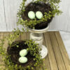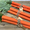 This is a Baseball Bat Carrot door hanger handmade by me. I used 3 plastic baseball bats wrapped each one in two types of orange yarn, add greens to the top of each one then tied them together with raffia. I added a jute hanger on the back, a raffia bow and a large coffee stained hangtag.