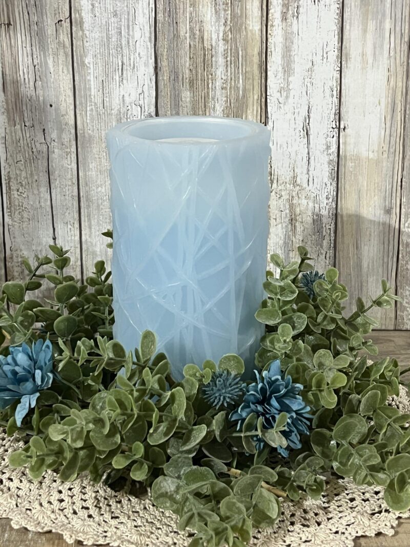 Multiple blue flowers rest around the lush greens of this hearty candle ring. 4.5″ I.D. X 12″ O.D.. Candle not included.