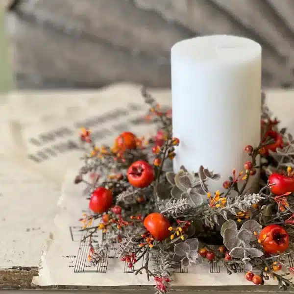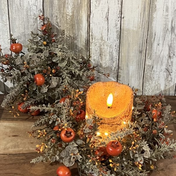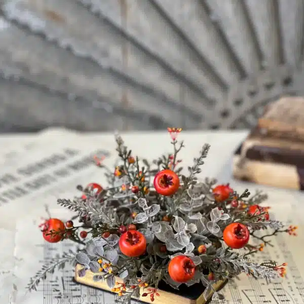 Cool toned eucalyptus foliage with showy orange berries and a splash of small orbs makes a beautiful autumnal statement that transitions easily from season to season.