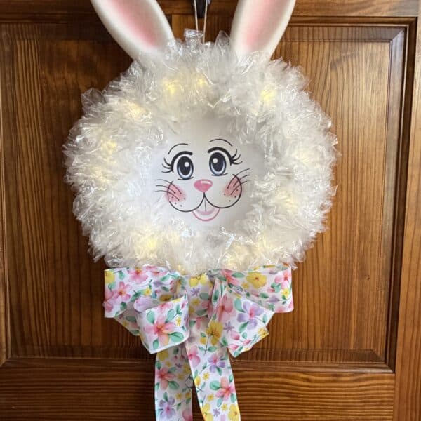 In this kit you will receive a set of flocked bunny ear picks, a box of 200 fold over baggies, wire hanger, 12″ wood circle, bunny face print out, floral bow, four 8″ zip ties, and a 20″ piece of cream jute for the hanger. You can watch the video on YouTube or look at the blog to see how to put the Bunny Baggie Wreath together.