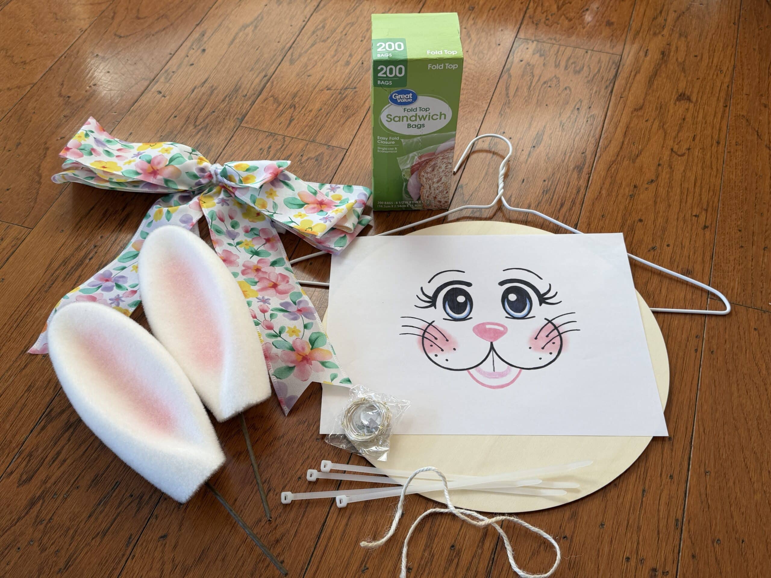In this kit you will receive a set of flocked bunny ear picks, a box of 200 fold over baggies, wire hanger, 12″ wood circle, bunny face print out, floral bow, four 8″ zip ties, and a 20″ piece of cream jute for the hanger. You can watch the video on YouTube or look at the blog to see how to put the Bunny Baggie Wreath together.