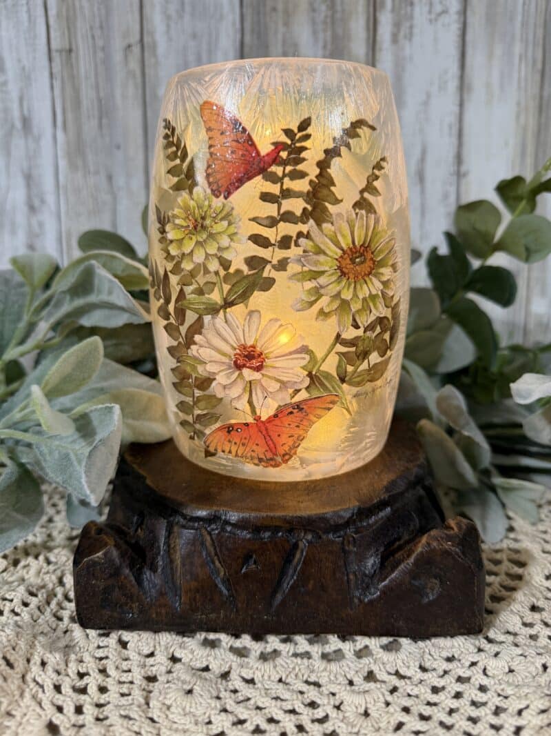 Bring a little garden glow indoors with this frosted glass vase, decorated with delicate butterflies and daisies. The textured glass diffuses a warm light, creating a cozy accent for shelves, mantels, or bedside tables.