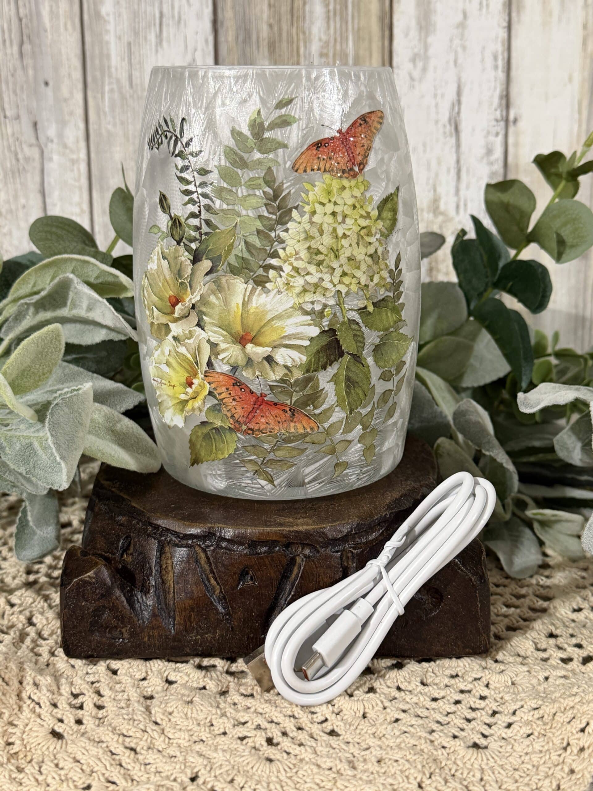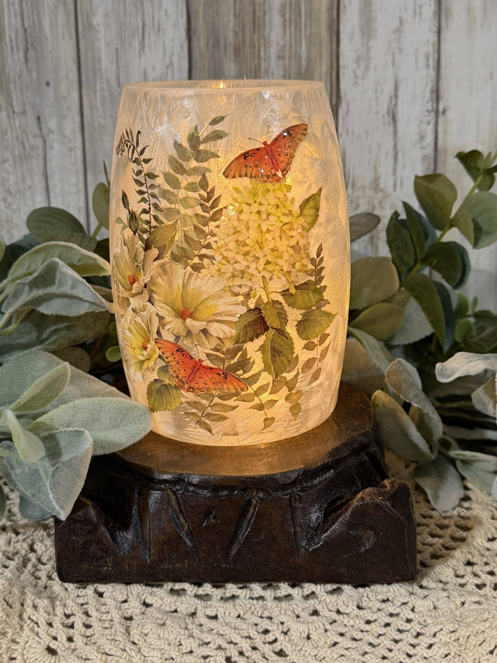 Bring a little garden glow indoors with this frosted glass vase, hand-decorated with delicate butterflies and soft white-green blooms. The textured glass diffuses a warm light, creating a cozy accent for shelves, mantels, or bedside tables.