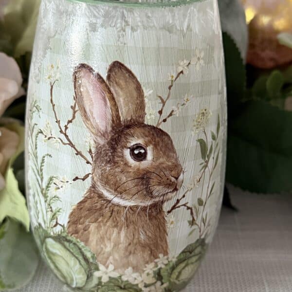 Cabbage Patch Bunny Pre Lit Vase :Bring a gentle glow to your spring décor with this charming pre-lit vase. Made of glass and measuring 5.25″ × 3.25″, it features a sweet bunny nestled among delicate branches and leafy cabbage—perfect for Easter, Passover, or everyday spring charm.The vase illuminates softly from within, powered by 2 AA batteries (not included) or the included USB cord for plug-in convenience. Use it as a glowing accent on a mantel, entry table, or centerpiece, or fill it with fresh or faux florals for extra seasonal cheer. A warm, versatile piece that works just as beautifully lit as unlit.