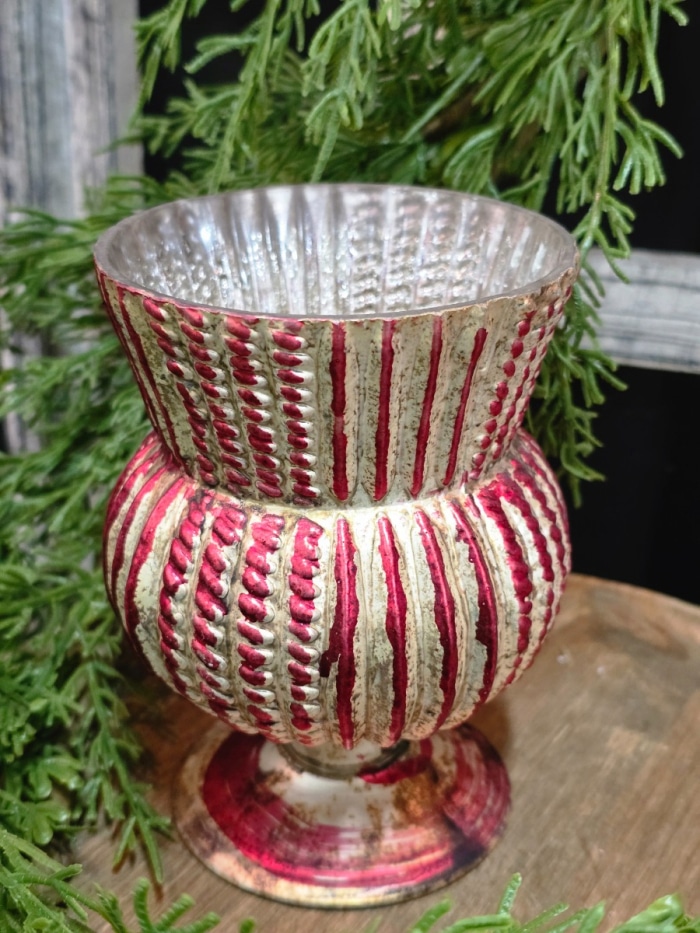 Add a festive touch to your decor with this adorable Glass Candy Striped Planter! 😊 Measuring 4″ x 4″ x 5.5″, this charming planter features a vintage-inspired design with red and white stripes reminiscent of classic candy canes. The textured glass exterior gives it a unique, handcrafted look, while the clear glass interior is perfect for showcasing small plants or decorative accents. Place it on a table, mantle, or shelf to bring some holiday cheer to your space.
