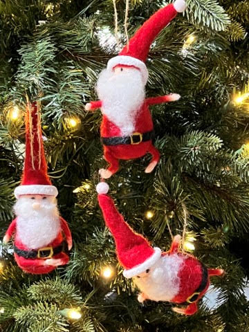 A set of three felt Santa’s featuring various yoga poses. Christmas ornaments are easy to hang by attached loops and complement well with other felt critters and holiday décor.
