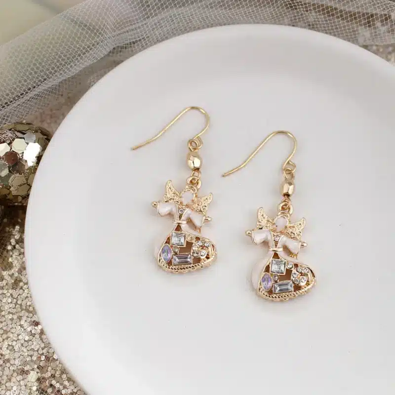 Gold tone shepherd hook earrings featuring enamel and crystal angel charms. Charms measure about an inch in height.