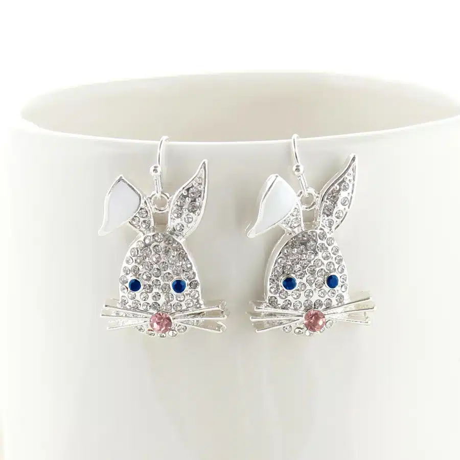 Silver tone earrings featuring a crystal Easter bunny face design on shepherd hooks. Bunny face charms measure around 1.25” in height.