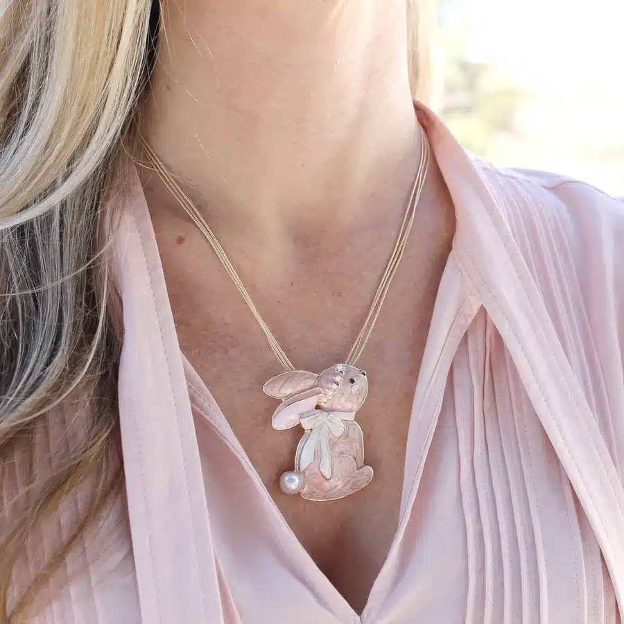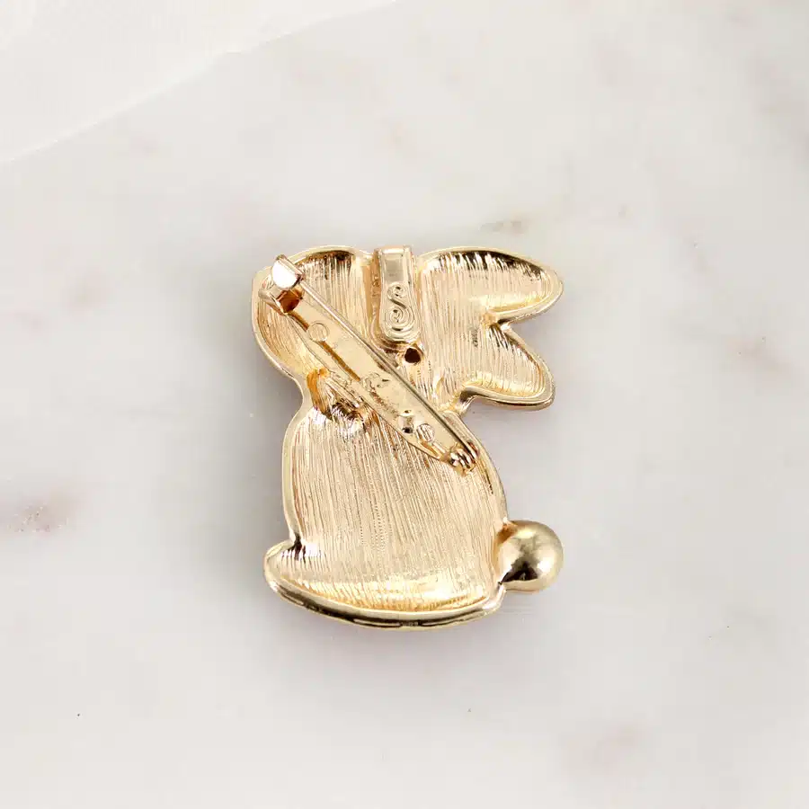 Gold tone magnetic clasp pin/pendant featuring an enamel rabbit design with pearl accents. This sweet Easter bunny measures about two inches in height.