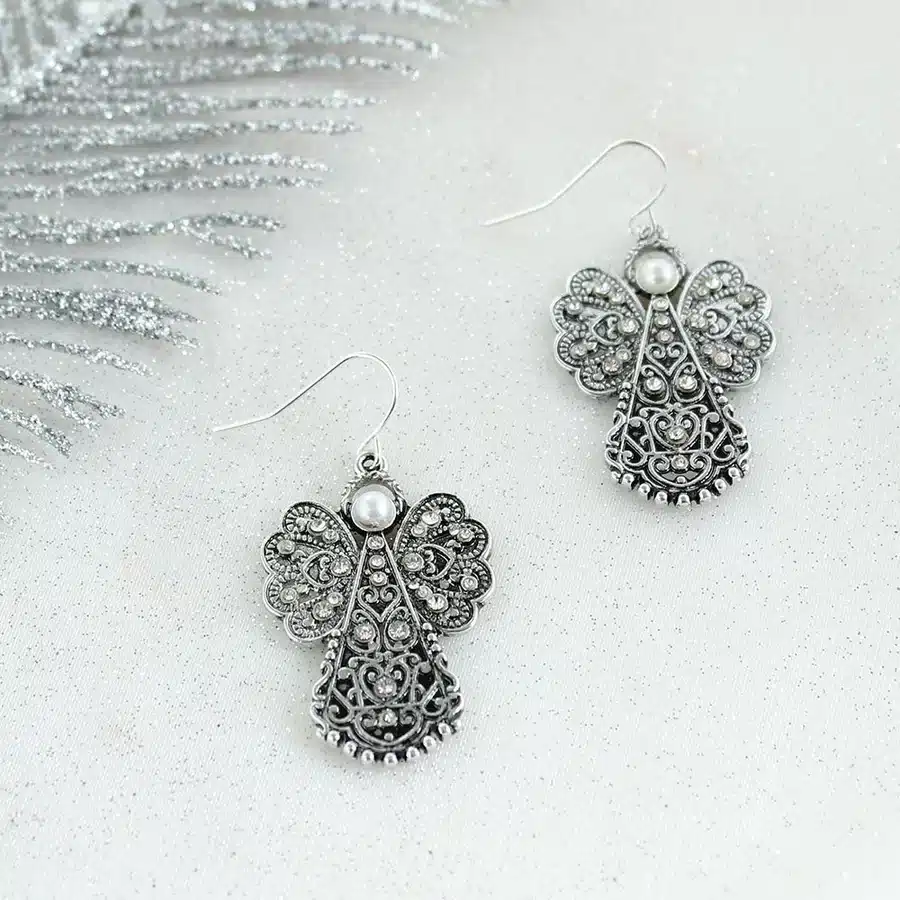 Silver tone shepherd hook earrings featuring a filigree angel design with imitation pearl and crystal accents. Angel measures approximately 1.5” in height.