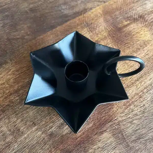 This Set of 2 Flower Taper Holders are made of metal, have a simple handle and a smooth black finish. Each taper holder measures 4.5” across and is ideal for displaying year round.