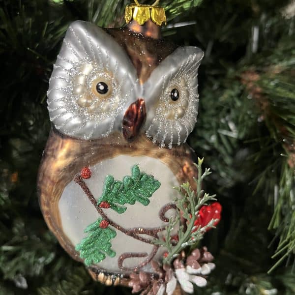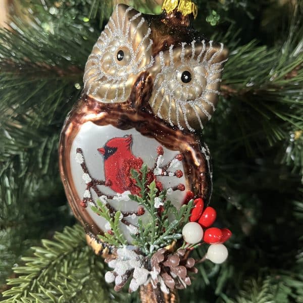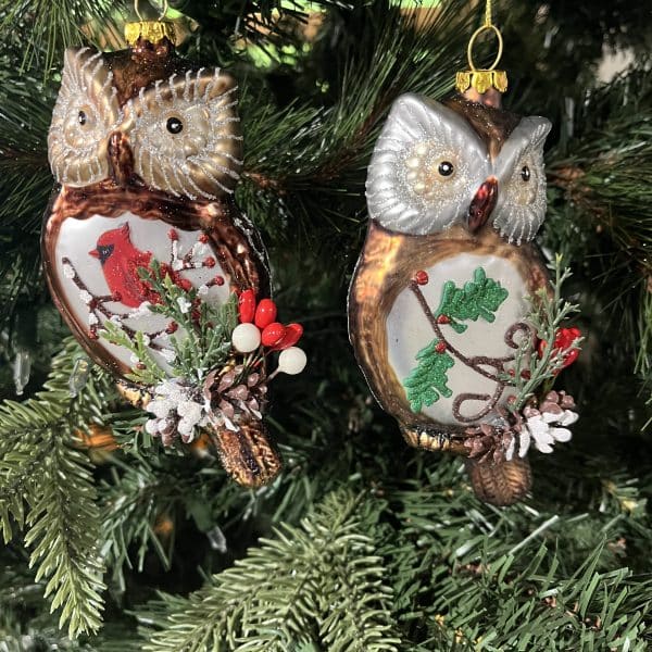 These glass brown owl ornaments from Kurt Adler are a festive addition to any holiday décor or Christmas tree. Included in this assortment are a glittered owl with a holly leaf and berry design and a glittered owl with a red cardinal and branch design.