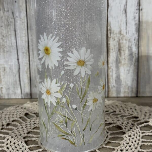 Bring a little wildflower meadow indoors. This 8″ tall × 3.5″ diameter glass cylinder is printed with white daisies and slender green stems against a softly glittered background. When lit, a string of 15 warm fairy lights glows from inside, scattering gentle sparkle through the glass and making the petals look freshly backlit.