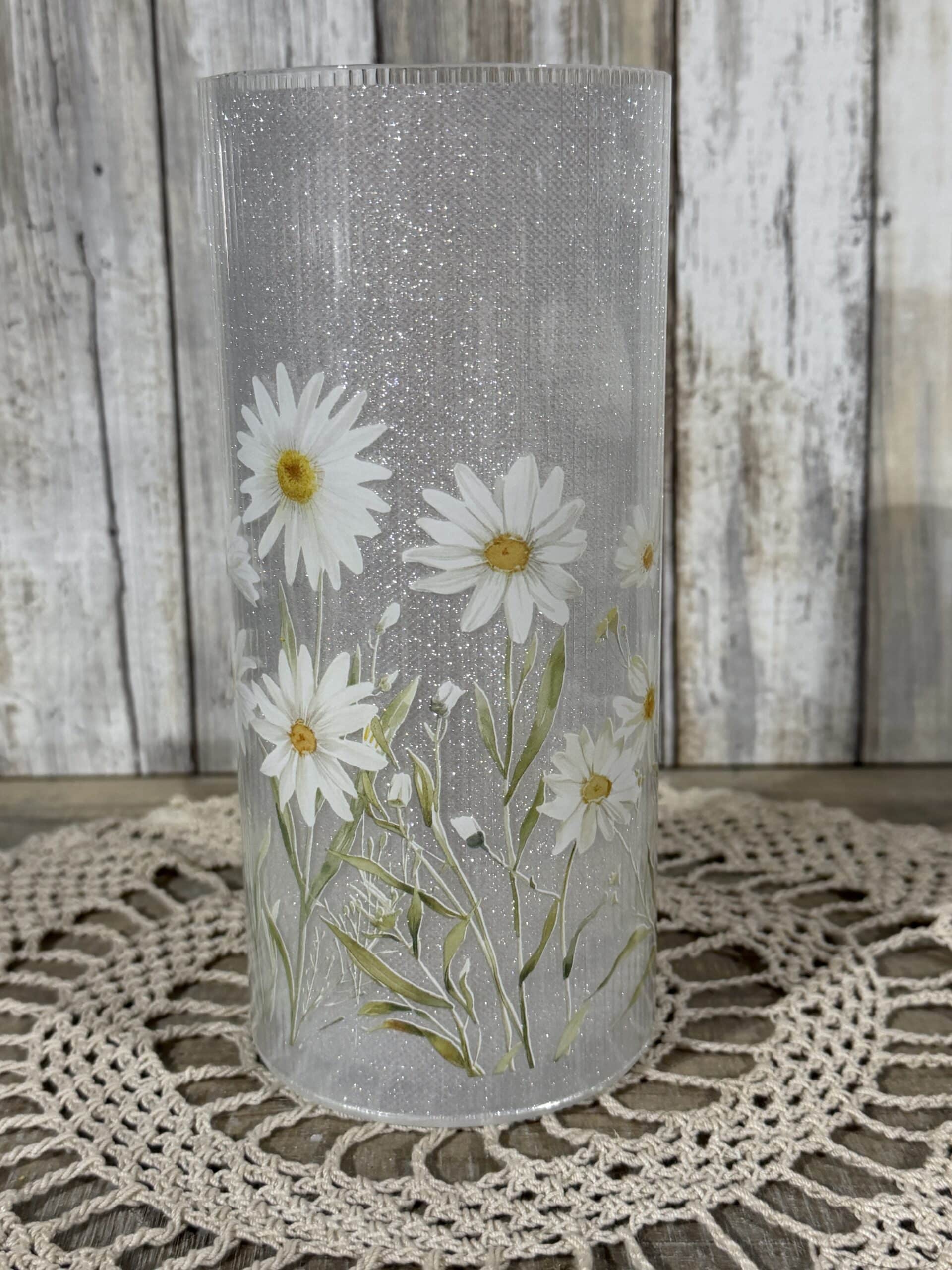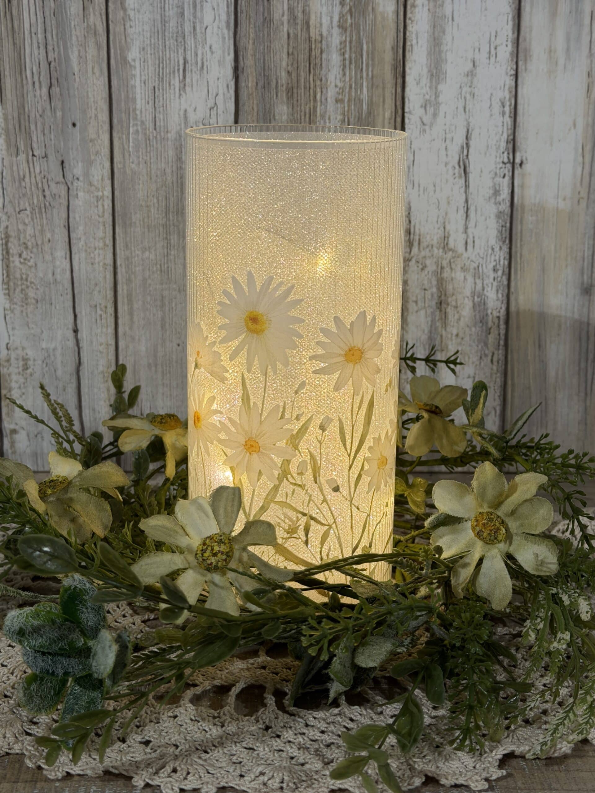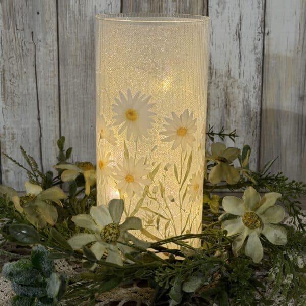 Bring a little wildflower meadow indoors. This 8″ tall × 3.5″ diameter glass cylinder is printed with white daisies and slender green stems against a softly glittered background. When lit, a string of 15 warm fairy lights glows from inside, scattering gentle sparkle through the glass and making the petals look freshly backlit.