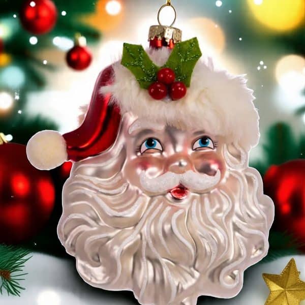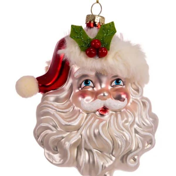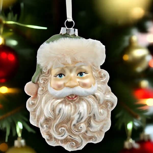 Add a festive touch to your holiday decor with Kurt Adler’s Glass Santa Head Ornament set Kurt Adler’s glass Santa head ornaments are a festive addition to any holiday décor or Christmas tree. One glass ornament features a Santa head wearing a traditional Santa hat with glittered accent The second charming ornament features a beautifully crafted Santa head, complete with a playful green hat that adds a pop of color and a whimsical twist to the classic holiday figure. Meticulously designed with intricate detailing, these glass ornaments showcase Santa’s jolly expression and classic features, making them a delightful addition to your Christmas tree or festive displays.