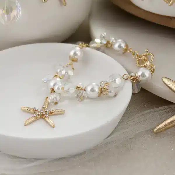 Gold tone toggle clasp bracelet featuring imitation pearl and crystal beads with a gold starfish charm. Charm measures about an inch in size.