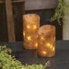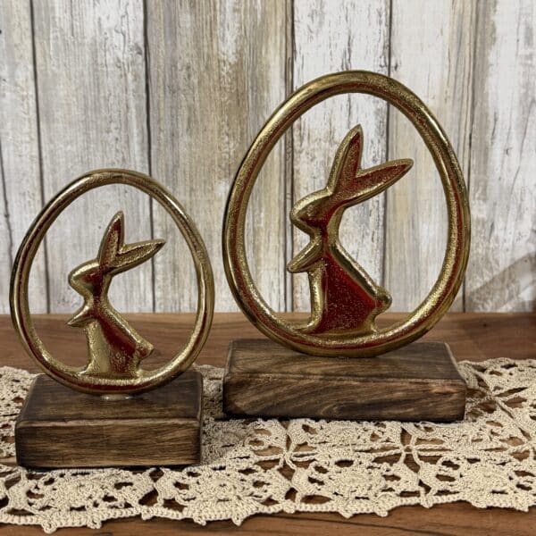 Elegant Golden Bunny Egg Stand Set – two rustic decorative pieces featuring a polished gold‑finished metal bunny silhouette inside a circular egg frame, each mounted on a rich, stained wood base. The set includes a larger stand measuring 6.25” × 4.5” × 2” and a smaller companion measuring 4.75” × 3.25” × 2”. Perfect for adding vintage charm and whimsical flair to shelves, mantels, or garden displays. Crafted with durable metal and solid wood for lasting style and timeless appeal.