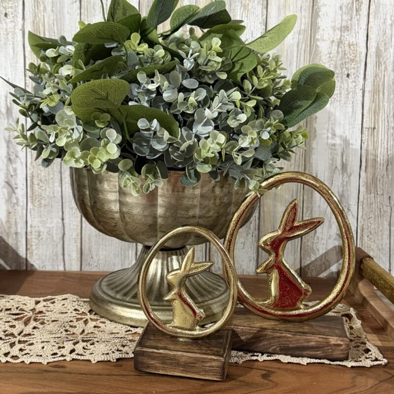 Elegant Golden Bunny Egg Stand Set – two rustic decorative pieces featuring a polished gold‑finished metal bunny silhouette inside a circular egg frame, each mounted on a rich, stained wood base. The set includes a larger stand measuring 6.25” × 4.5” × 2” and a smaller companion measuring 4.75” × 3.25” × 2”. Perfect for adding vintage charm and whimsical flair to shelves, mantels, or garden displays. Crafted with durable metal and solid wood for lasting style and timeless appeal.