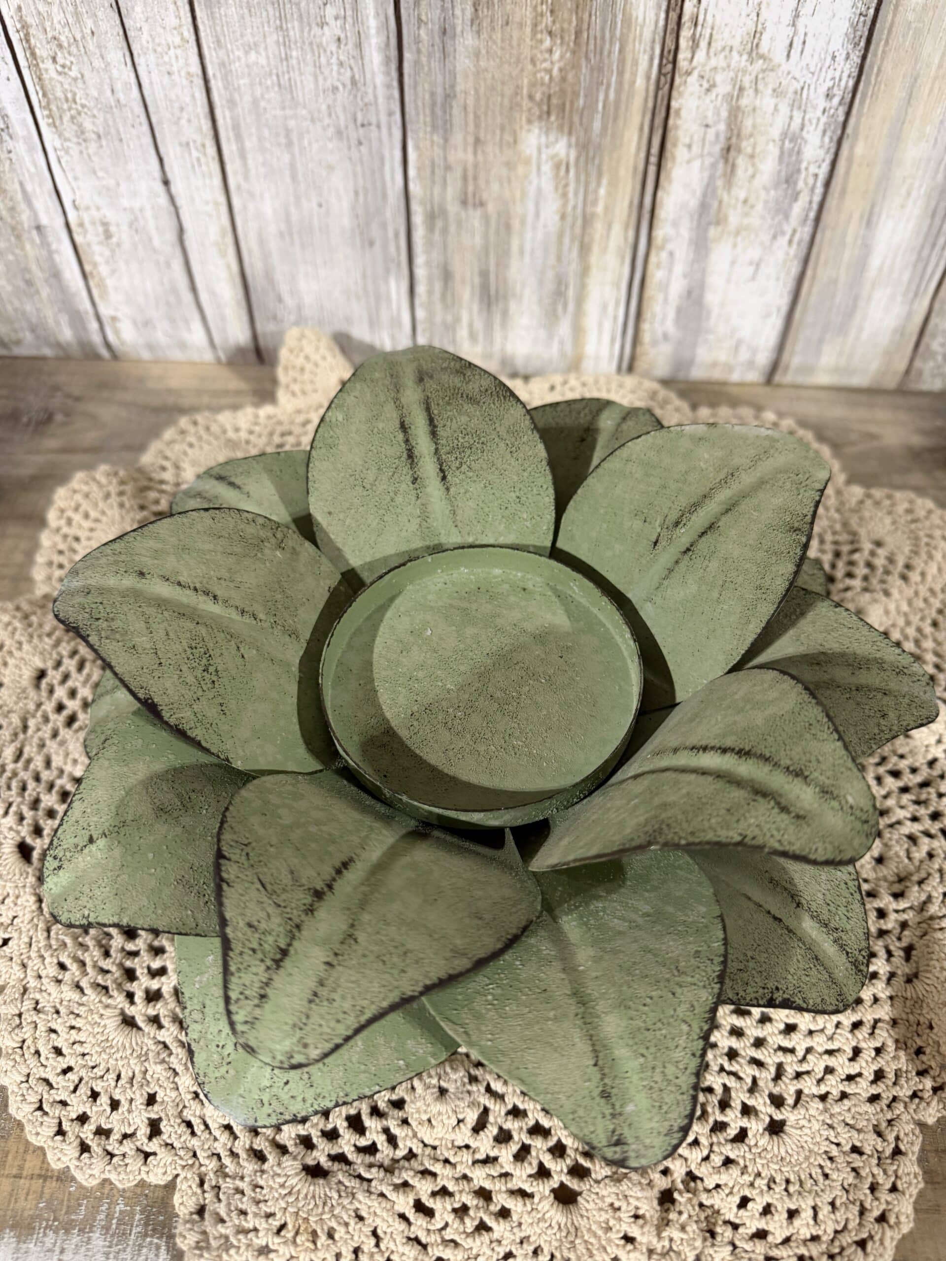 Bring a touch of rustic charm to your table or mantel with this decorative metal candle holder shaped like a blooming flower. Crafted from sturdy metal with a distressed sage-green finish, the layered petals have a subtly textured, weathered look that fits farmhouse, cottage, or boho settings.