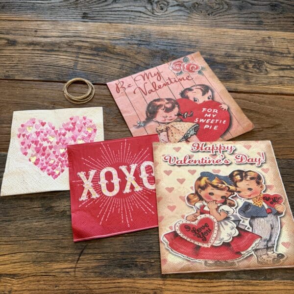 In this Hanging Heart Vintage Valentine Craft Kit you will receive 3 galvanized metal hearts, 4 napkins with the vintage valentine prints, 2 napkins with heart print, 2 napkins with XOXO print and 36″ of gold cord to use for the hangers. These hearts turn out adorable and would look great on a tree or fireplace mantle. There is a video on my Facebook and YouTube page on how make the vintage valentine hearts.