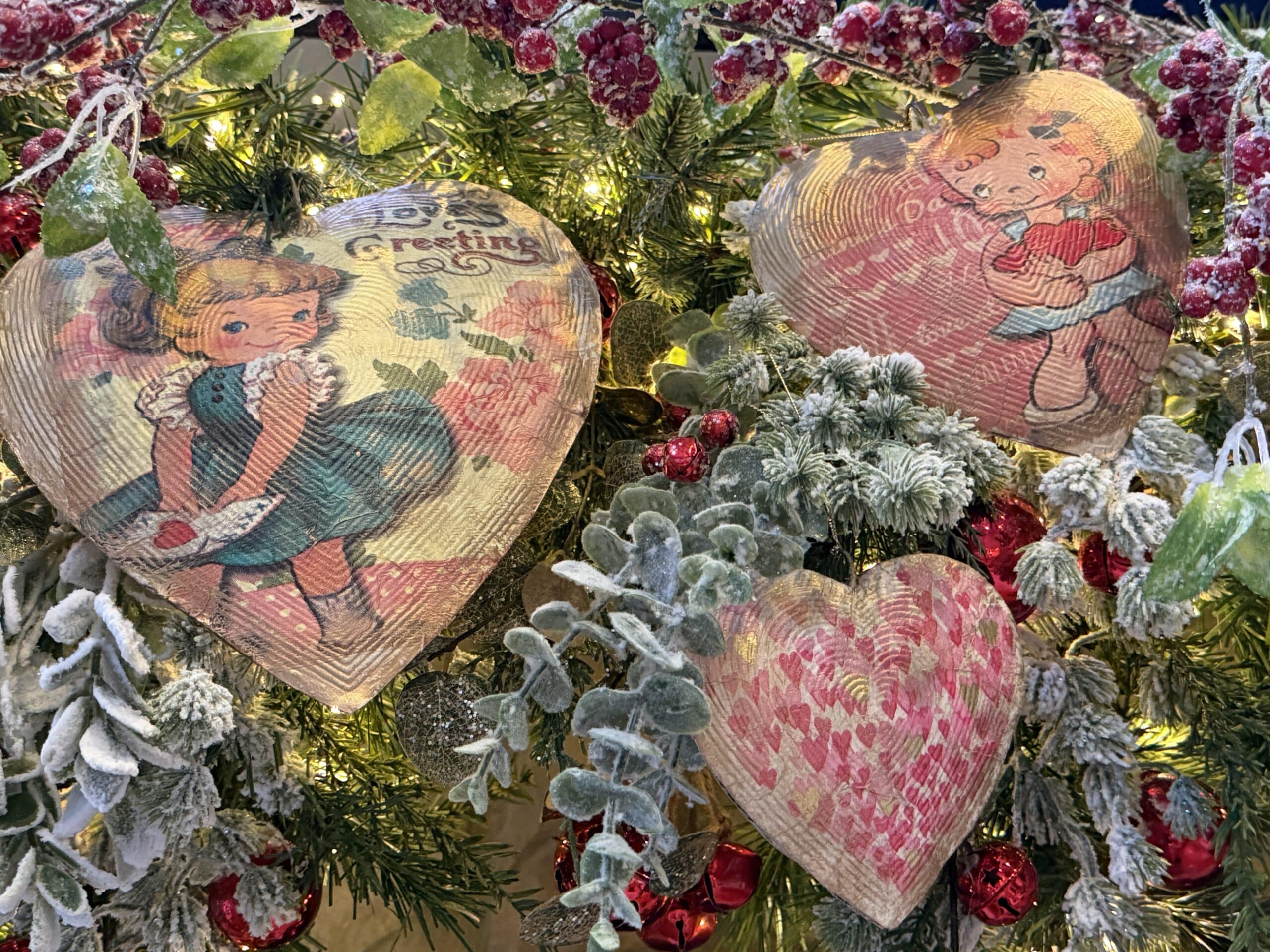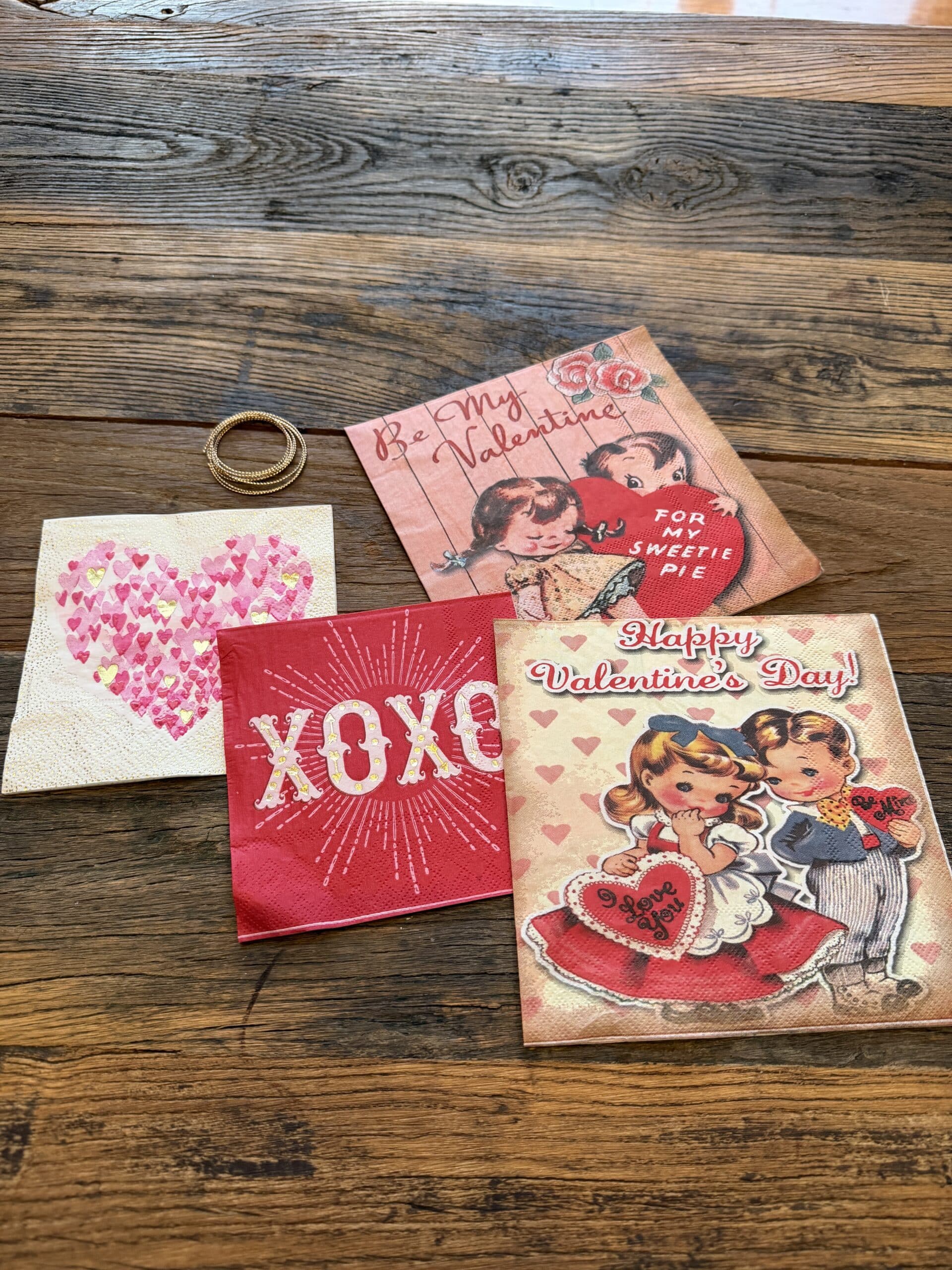 In this Hanging Heart Vintage Valentine Craft Kit you will receive 3 galvanized metal hearts, 4 napkins with the vintage valentine prints, 2 napkins with heart print, 2 napkins with XOXO print and 36″ of gold cord to use for the hangers. These hearts turn out adorable and would look great on a tree or fireplace mantle. There is a video on my Facebook and YouTube page on how make the vintage valentine hearts.