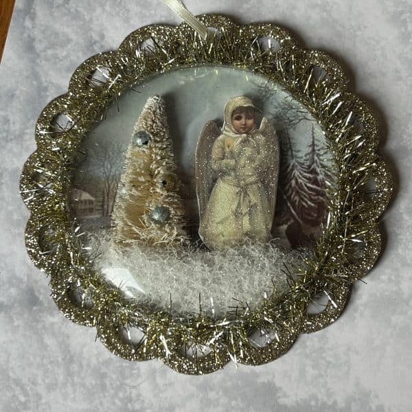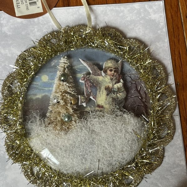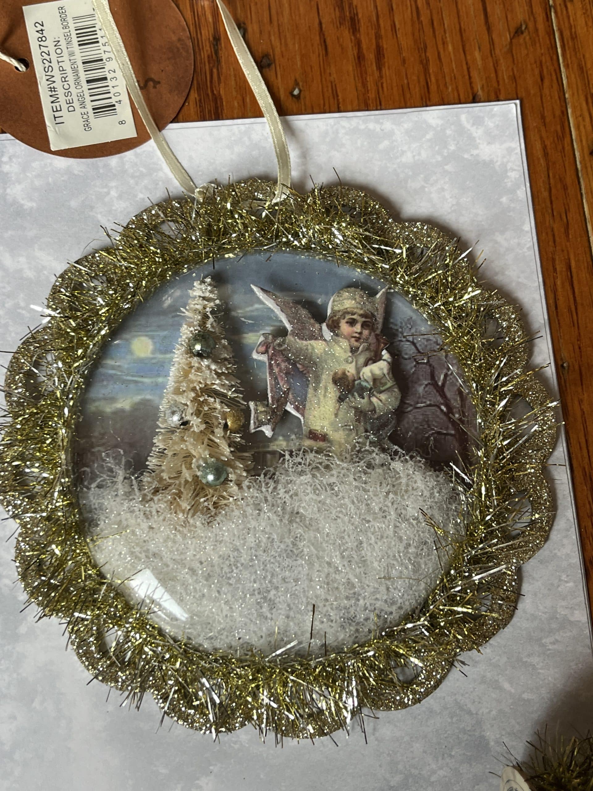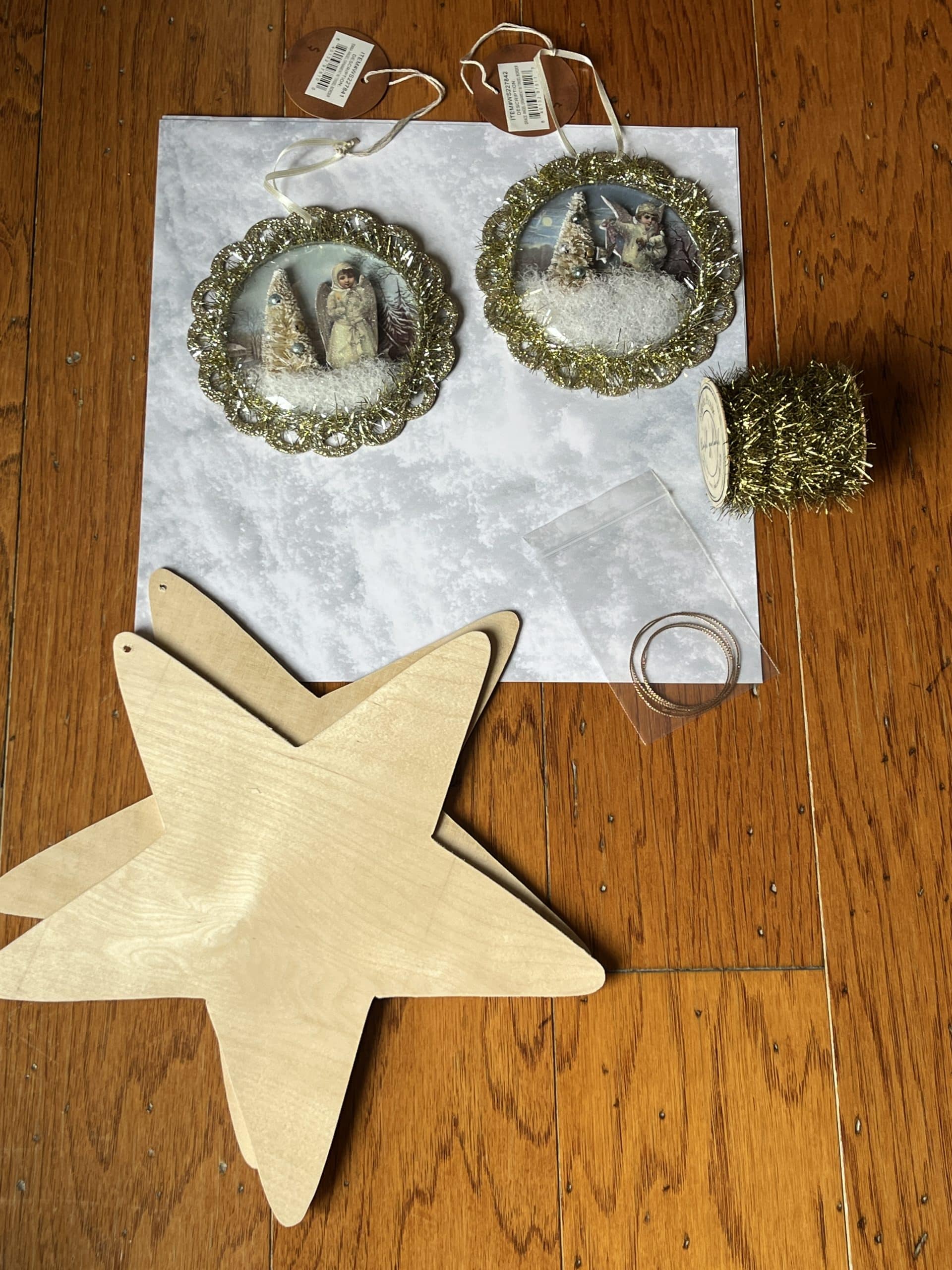 In this Hanging Star Angel Craft kit you will receive two wooden stars, two angel ornaments with tinsel border, four sheets of cloud print scrapbook paper, one 72″ roll of gold tinsel garland, and two 12″ pieces or gold cord to use as the hangers.
