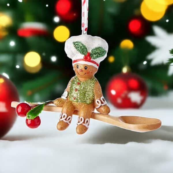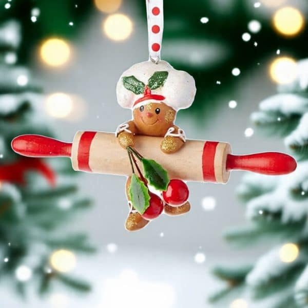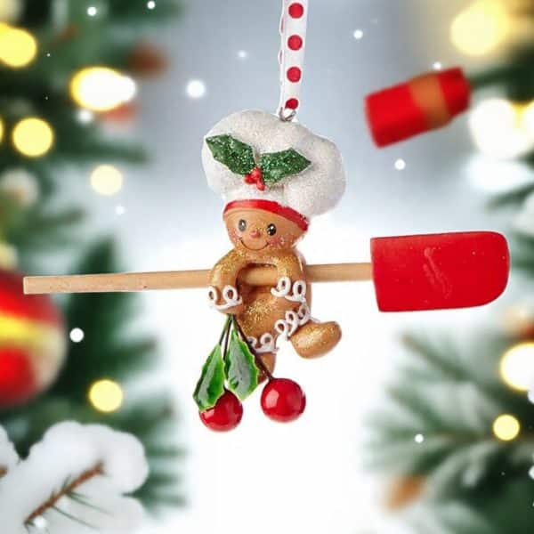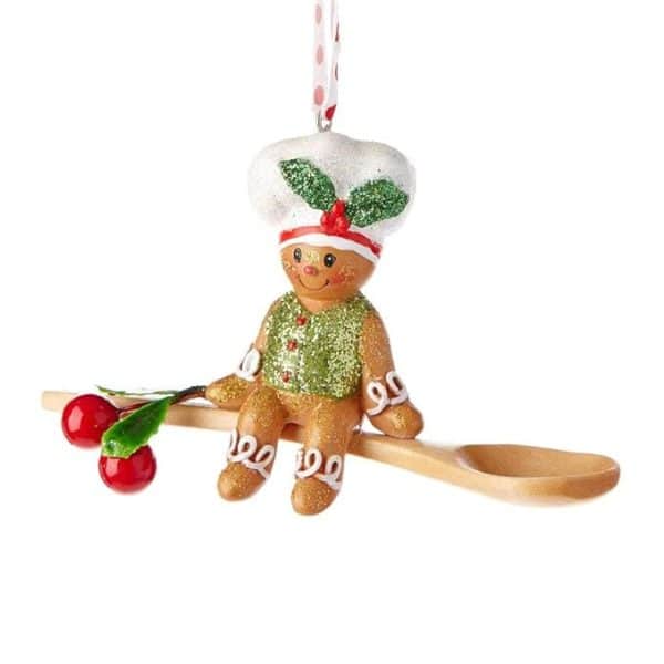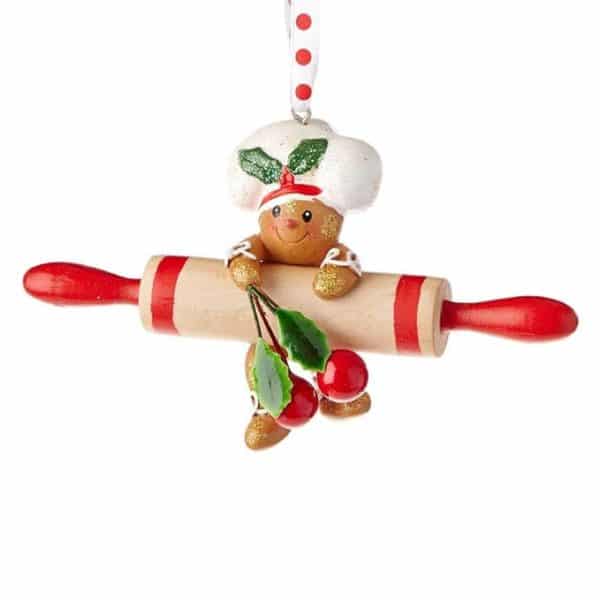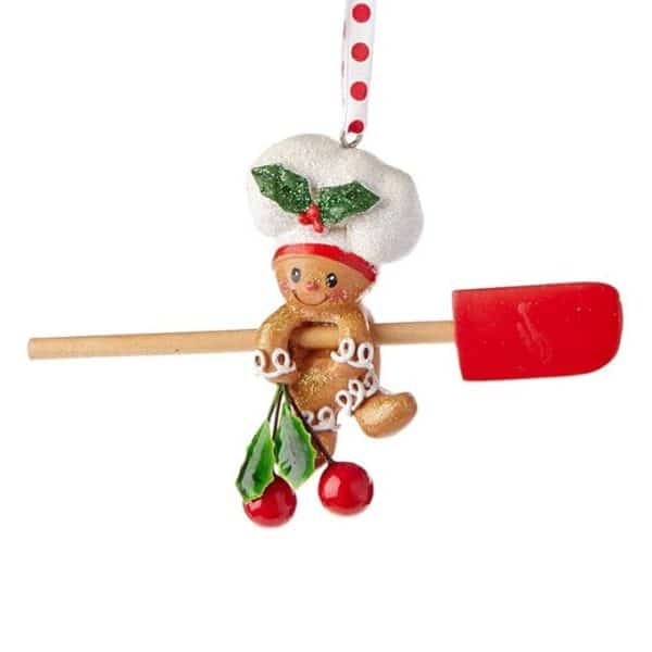 These gingerbread baking tool ornaments by Kurt Adler are a charming addition to any holiday décor or Christmas tree. This assortment of three features cute little gingerbread men in chef hats climbing on baking tools, including a wooden spoon, a spatula and a rolling pin. Each gingerbread man has ornate detailing such as white frosting trim and a sprig of holly on his chef hat!