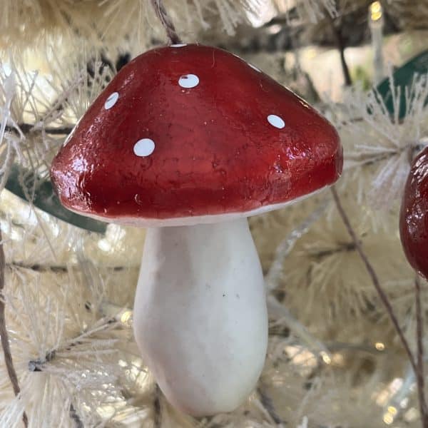These Red Mushroom Ornaments from Kurt Adler bring a touch of whimsy and woodland charm to holiday decorations. These ornaments feature meticulously crafted mushroom designs in a vibrant red hue, evoking a sense of enchantment and seasonal festivity. Each ornament is exquisitely detailed, mimicking the unique features of mushrooms found in nature. The assortment offers variations in shapes, or embellishments, adding diversity and character to the overall presentation. Their vivid red color stands out against greenery or other decorations, making them a striking addition to a Christmas tree, garland, or wreath. These ornaments can also be used in tabletop displays, enhancing the seasonal ambiance of any setting. Their lightweight construction makes them easy to hang or display, giving you the flexibility to incorporate them into various holiday decor arrangements. These whimsical mushroom ornaments infuse a sense of wonder and a touch of woodland magic into your seasonal displays, inviting a joyful and festive atmosphere.
