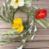 This mini lavender herb candle ring is made of green paper wrapped floral wire with foam leaves, plastic greens and lavender.