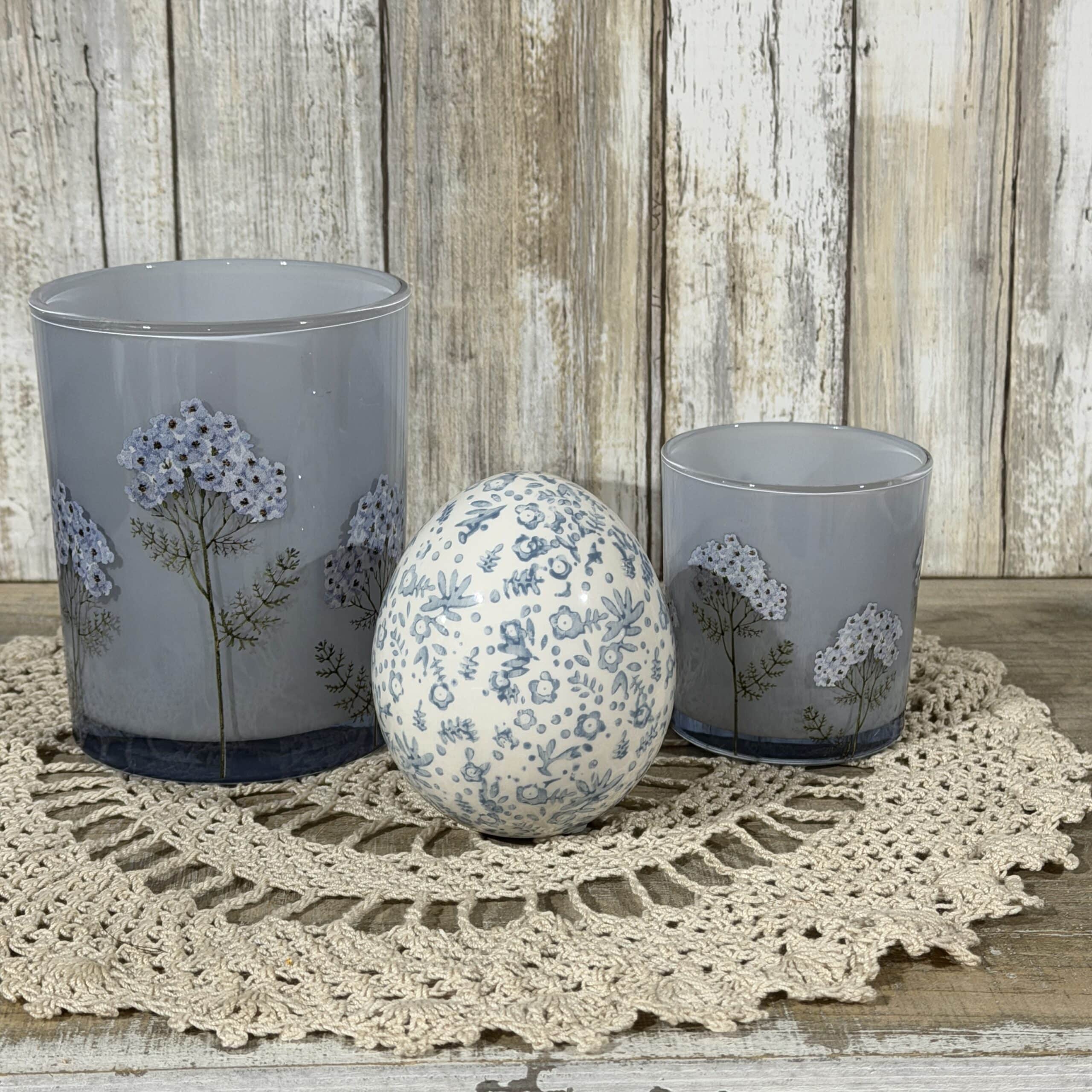 The collection includes two hand‑blasted light‑blue glass jars etched with delicate floral patterns: one 5″ tall and one 3″ tall, perfect for candles (candles not included) to create a soft, ambient glow. Paired with a smooth 3.5″ dolomite egg, the set adds a refined, natural accent for display or meditation.