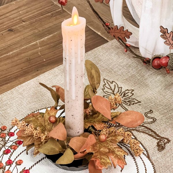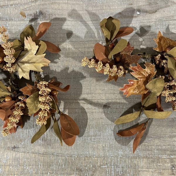 These Maple & Fern Mini Candle Rings are sure to infuse your home with the rich, russet colors of the fall woodlands, blending seamlessly with other seasonal decor. Realistic natural tones of rust, orange-gold and olive green add a lovely, warm touch and the soft, natural-looking leaves bring a lushness with varied textures and finishes that enhance every setting with forest charm. Tiny berry clusters set among the leaves offer dimension and unique visual interest to the autumn accent. Combine with other fall botanicals for a layered, realistic look that lasts the whole season.