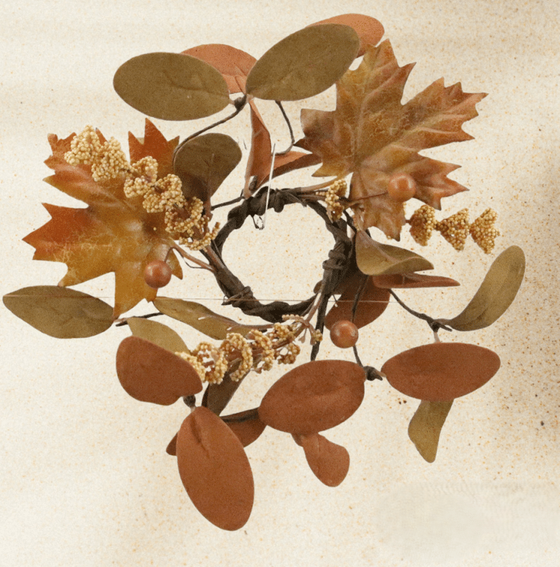 These Maple & Fern Mini Candle Rings are sure to infuse your home with the rich, russet colors of the fall woodlands, blending seamlessly with other seasonal decor. Realistic natural tones of rust, orange-gold and olive green add a lovely, warm touch and the soft, natural-looking leaves bring a lushness with varied textures and finishes that enhance every setting with forest charm. Tiny berry clusters set among the leaves offer dimension and unique visual interest to the autumn accent. Combine with other fall botanicals for a layered, realistic look that lasts the whole season.