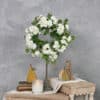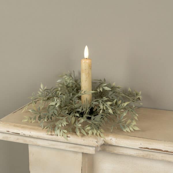 Hand-finished mini rings of soft, variegated ficus foliage frame a slender taper (not included) for a quiet, natural accent. Each ring measures 8″ outer diameter with a 1″ opening, sized to nest on mantels, shelves, or as a pair down a tablescape. The muted sage-green leaves and speckled cream candle sleeves bring farmhouse warmth without overwhelming a space. Sold as a set of two, they’re ready to flank a mirror, bracket a doorway, or sit together for symmetrical, everyday charm.