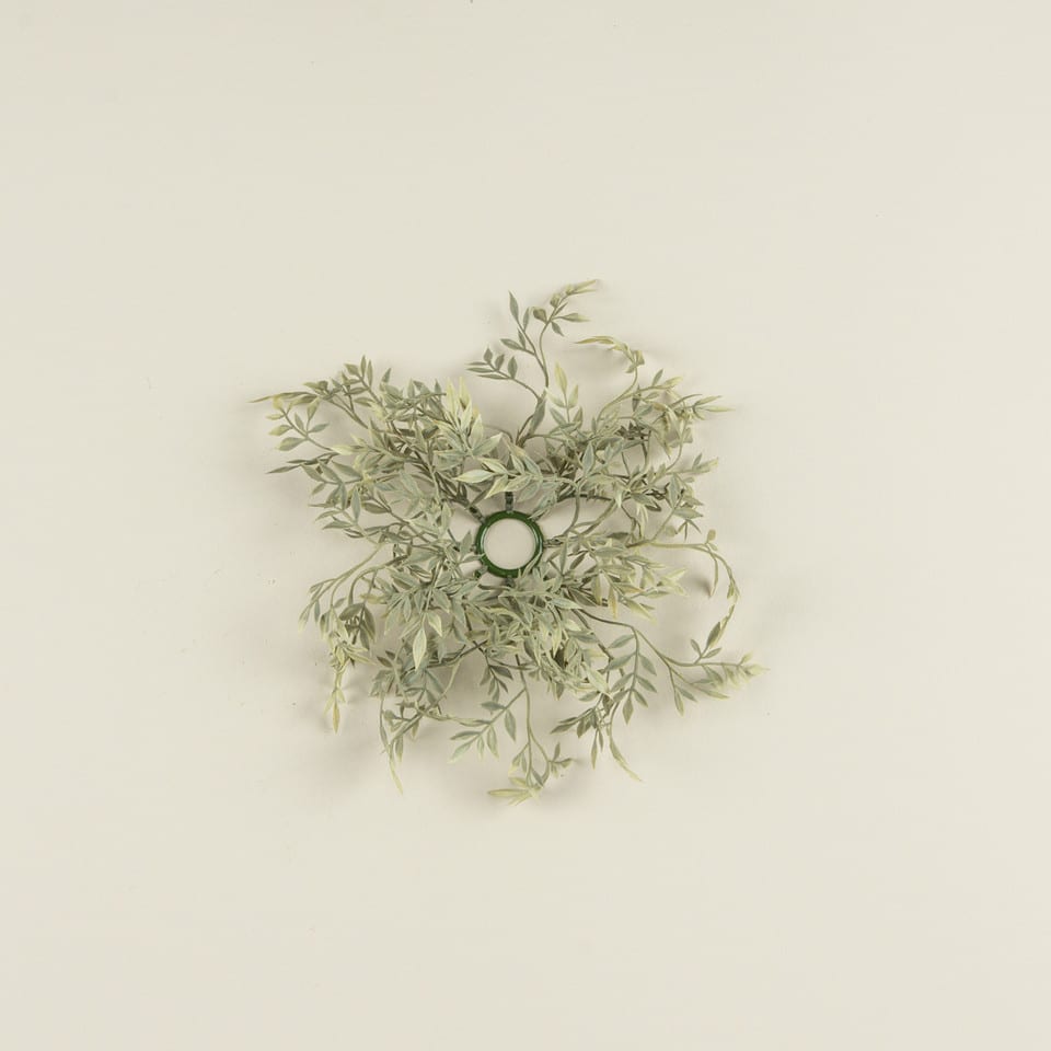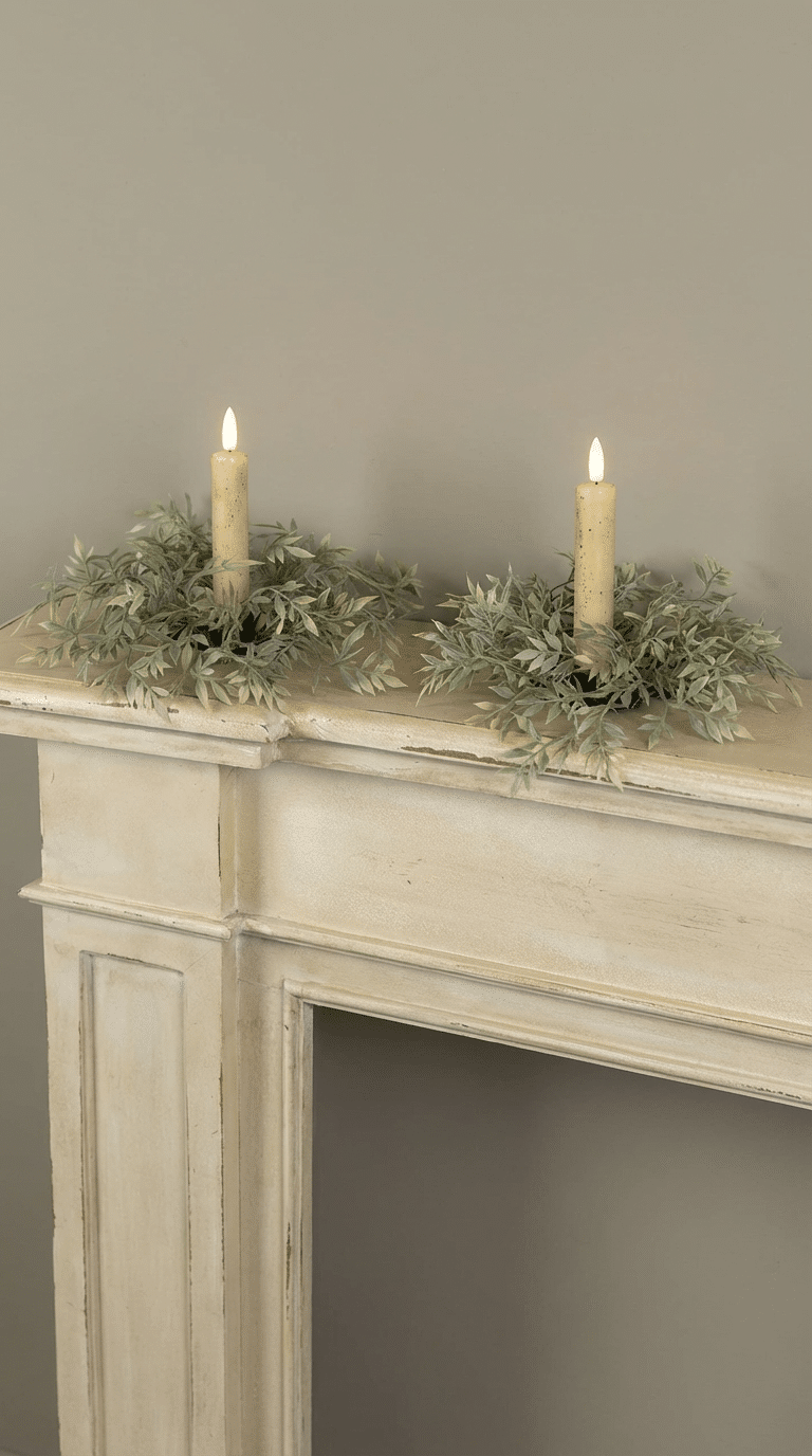Hand-finished mini rings of soft, variegated ficus foliage frame a slender taper (not included) for a quiet, natural accent. Each ring measures 8″ outer diameter with a 1″ opening, sized to nest on mantels, shelves, or as a pair down a tablescape. The muted sage-green leaves and speckled cream candle sleeves bring farmhouse warmth without overwhelming a space. Sold as a set of two, they’re ready to flank a mirror, bracket a doorway, or sit together for symmetrical, everyday charm.
