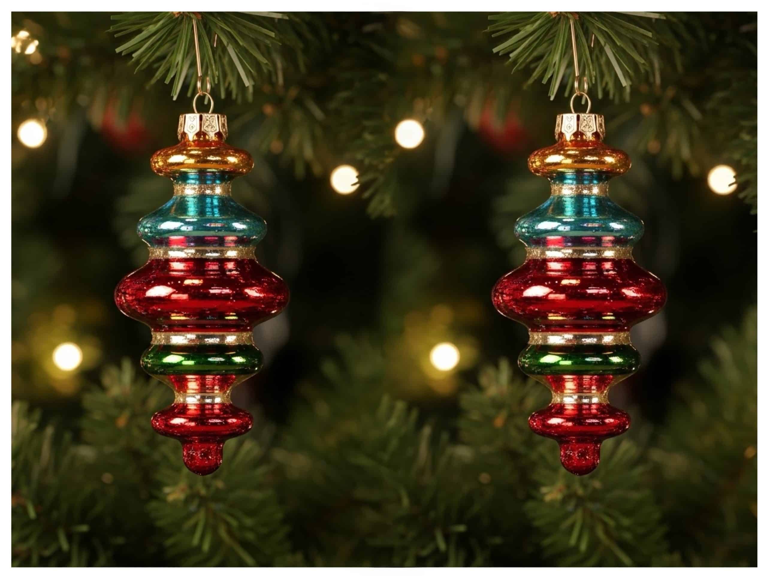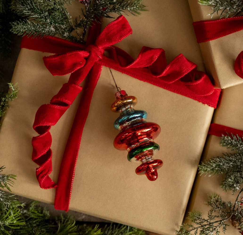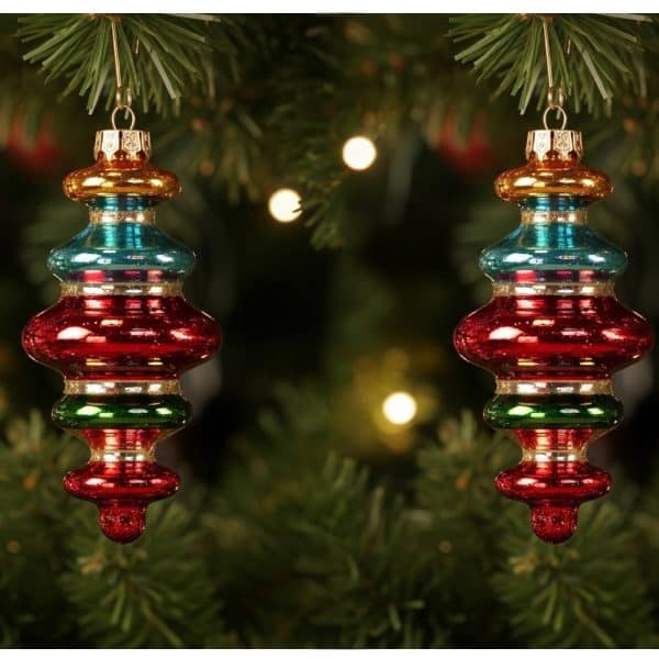 Add a festive touch to your holiday decor with this set of charming multi-colored glass finial ornaments! 🎄✨ Crafted from vibrant glass, these ornaments feature a stacked spiral design in red, green, blue, and gold hues. Perfect for topping a wrapped gift, adorning a Christmas tree, or adding a pop of color to your holiday display. The ornament’s playful colors and whimsical shape bring joy to any festive setting. Measures to fit standard gift wrapping or tree branches. A delightful addition to your holiday decorations!