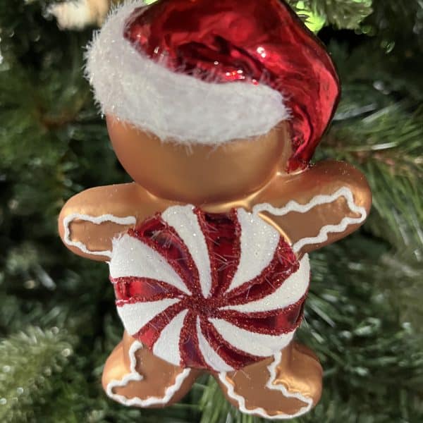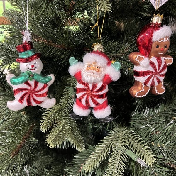 These Noble Gems™ retro-style glass Santa, snowman and gingerbread ornaments from Kurt Adler are a fun and festive addition to your holiday décor or Christmas tree. Each of these ornaments features a red and white glittered peppermint candy body . Each ornament measures approximately 4.2″ X 2.5″ X 1″